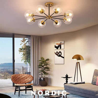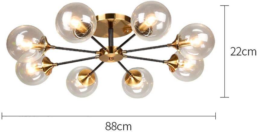 Le Lustre plafonnier OCITANIA-8 offre une touche de style nordique unique avec ses 8 boules de verre qui diffusent une lumière douce et diffuse. Compatible avec des ampoules E27 et mesurant 88cm de long et 22cm de haut en métal doré, ce plafonnier s'accordera parfaitement à n'importe quel décor.